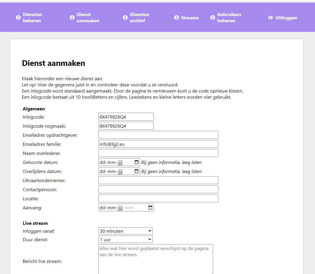 Elke dienst die wordt aangemaakt in het systeem van Uitvaartmeekijken.com ontvangt een unieke 10 cijferige code die bestaat uit hoofdletters en cijfers.